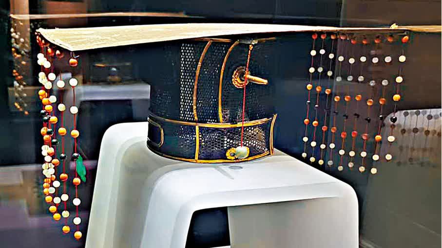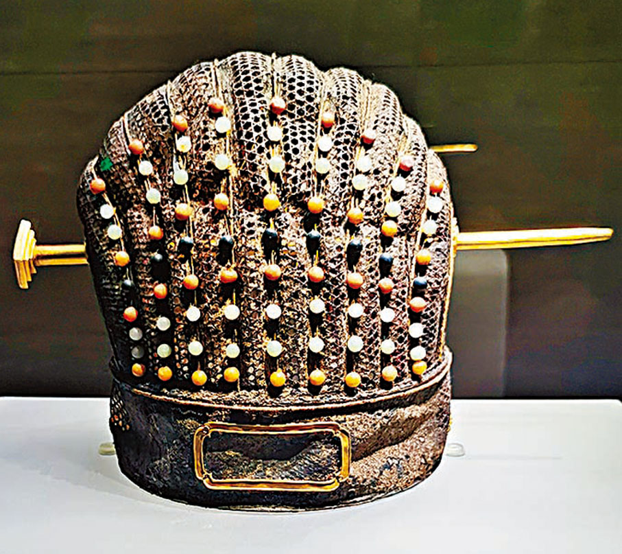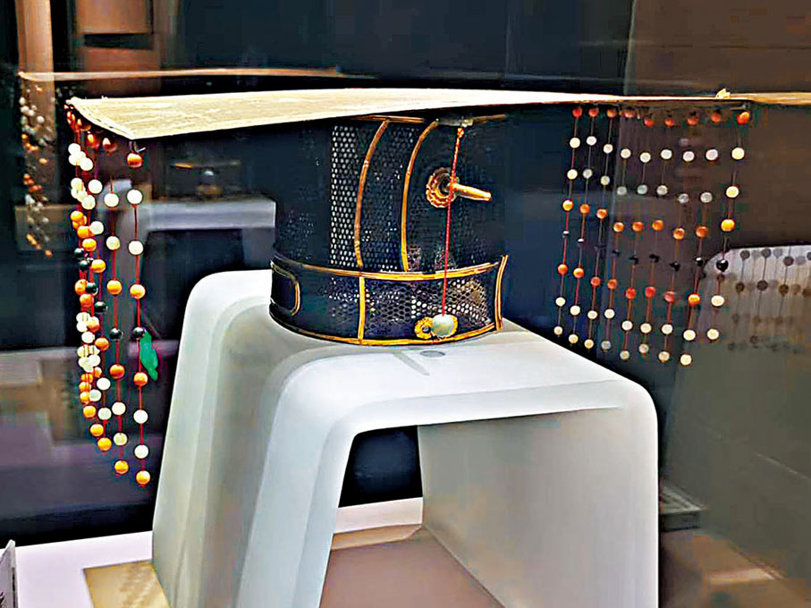 「冕是中國古代最隆重的冠飾,這件九旒冕是明代出土的唯一一件冕冠實物,填補了歷史空白。」據蔣群介紹,作為山東博物館十大鎮館之寶之一,九旒冕是研究中國古代服飾、禮制極為珍貴的實物資料。冕的頂上有一塊長49.4厘米的綖板,綖板前端圓後端方,以應「天圓地方」,表示博大之意。九旒冕前後共垂着9道旒,每道有9顆五彩玉珠,共用珠162顆。垂懸九旒正是明代親王冠冕的定制。