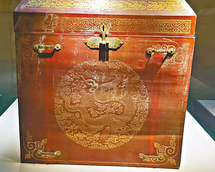 和九旒冕一起展出的還有九縫皮弁、烏紗摺上巾以及多件服飾珍品。其中戧金雲龍紋朱漆木箱,頗為引人注目。整個漆箱分三層,上層為套盒,中空,下層是抽屜,內外均髹朱漆,飾戧金雲龍紋,左右兩面上部各有蛇形提樑,前後兩面各有四隻穿帶鼻。此器物代表了元末明初漆器戧金工藝的高超水平,保存完整,堪稱國寶級文物。