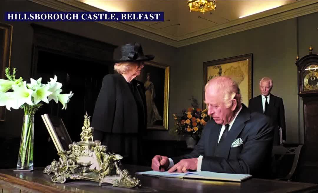 英王查爾斯三世和王后卡米拉前日訪問北愛爾蘭, 查爾斯三世在參觀希爾斯伯勒城堡時簽署訪客留言簿,其間因鋼筆漏墨而發火。