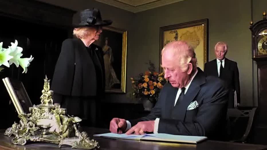 查爾斯三世在留言簿上簽字時,詢問身旁助手「今天是12日嗎?」助手說是13日,查爾斯三世便說「我記錯日期了」。卡米拉也在一旁說「你之前寫了12日」。
