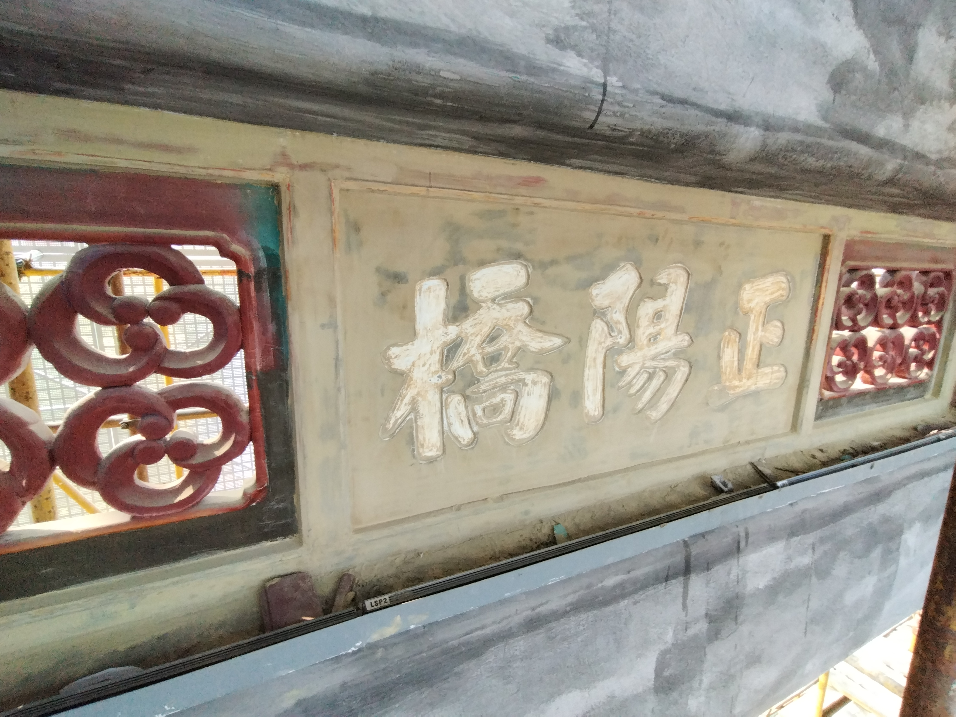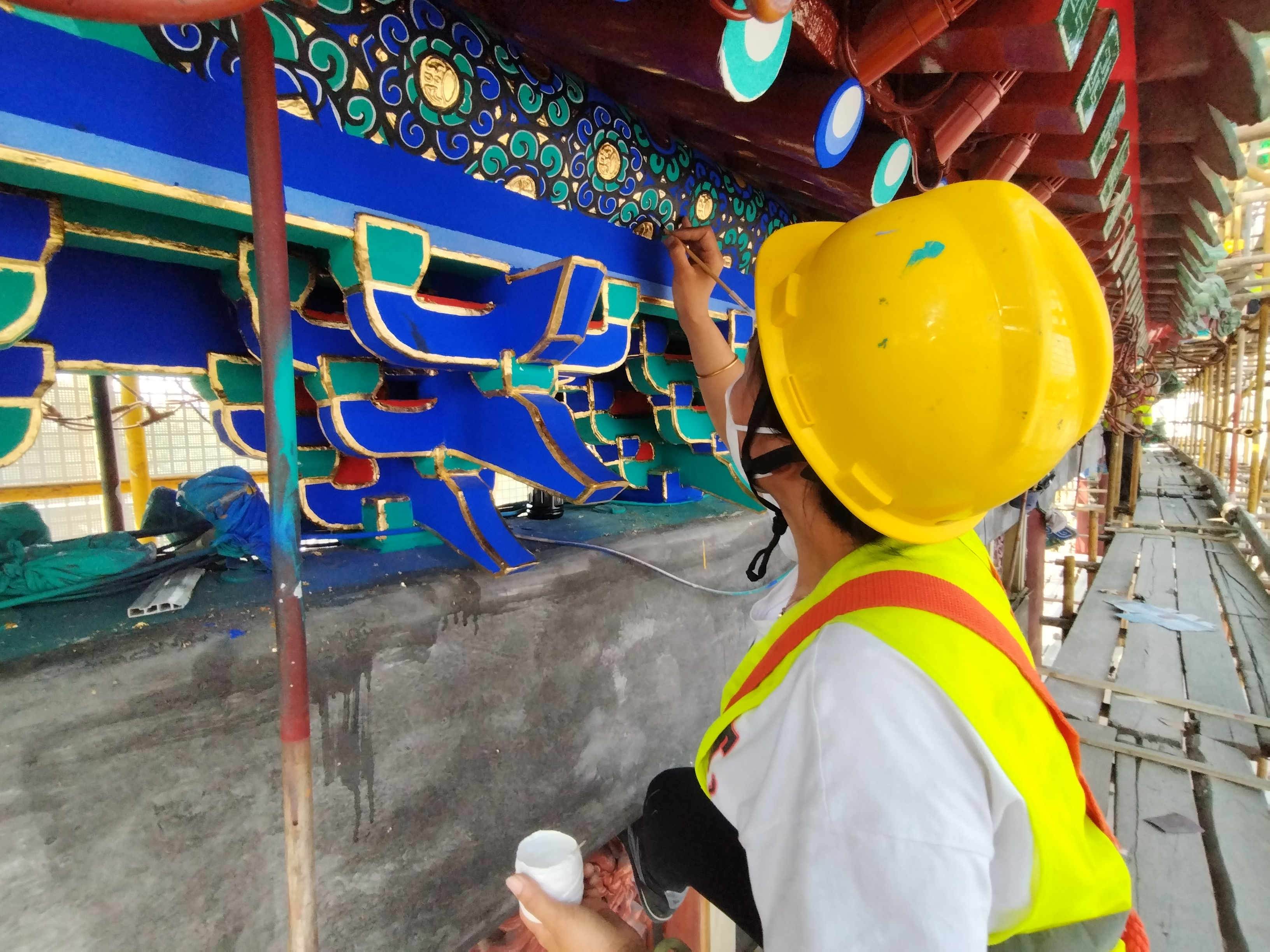 目前前門五牌樓施工現場已經搭建圍擋,全部包圍起來,順着馬道來到腳手架上,羅德陽介紹說,彩繪油飾翻新工程的第一道工序是斬砍見木。前期,工人用小斧子一點點砍掉前門五牌樓最外層褪色、破舊的油灰皮,剷除污垢灰跡,直到能清晰地看到顯露出來的木質結構。接下來,工人需在木質構件表面打底子,重新做「地仗」,「地仗」是油飾很重要的基層。地仗層材料由磚粉、石灰、麵粉、桐油、豬血、灰油等傳統材料調製而成,「我們會在木質構件上塗很多層地仗材料,在表層形成厚厚的灰殼,就像給構件穿了衣服,起到保護木質構件的作用。」此後,五牌樓正中牌匾上的「正陽橋」三個字也將重新貼金。
