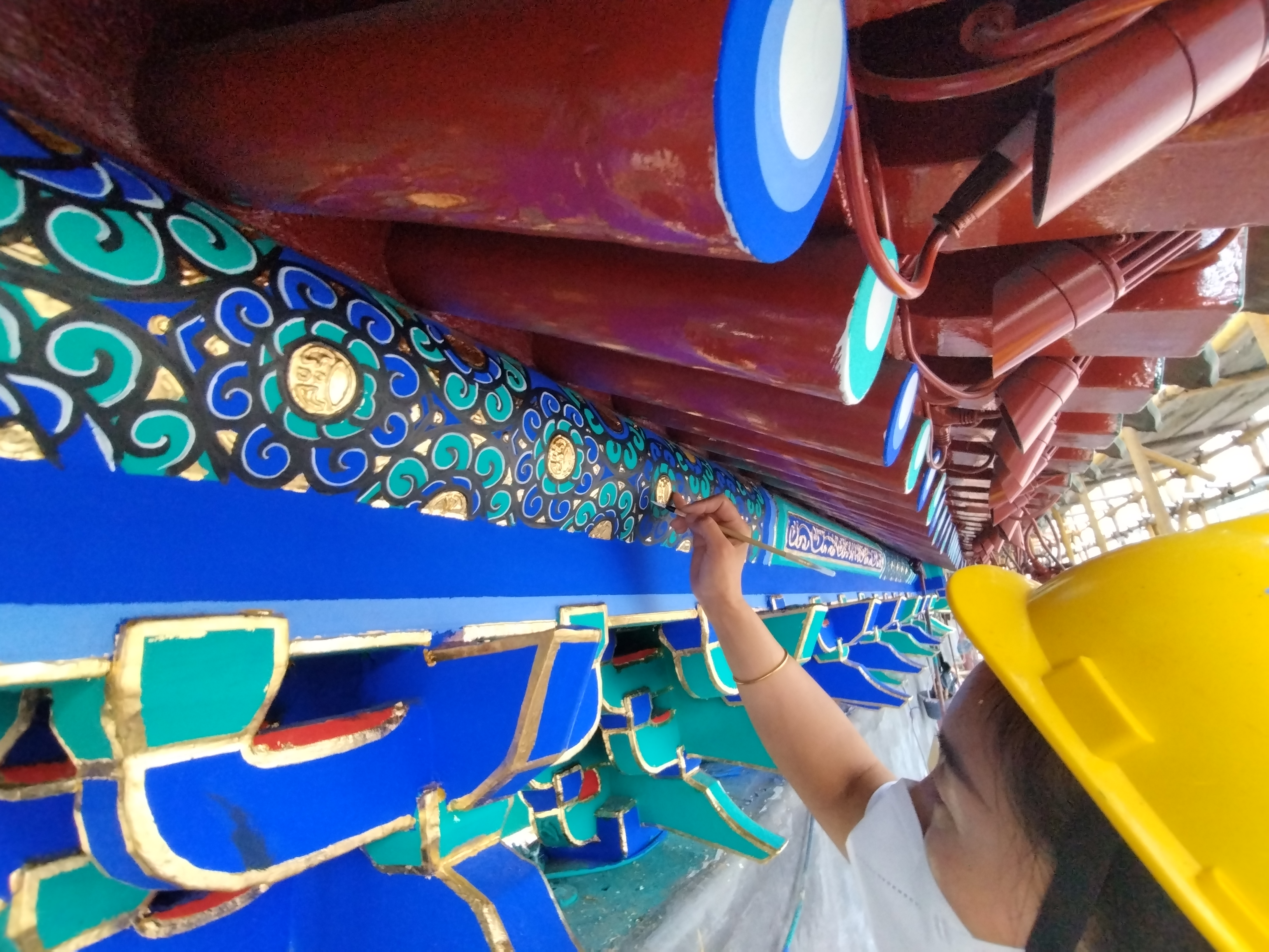 15年過去了,前門五牌樓雖然整體完好,但是經過長年的雨淋暴晒,油飾層出現開裂、局部脫落以及描金剝離、彩繪褪色等情況,對街區形象造成影響。「因此,在油飾彩繪翻新過程中,我們堅持修舊如舊,沿用了傳統的『一麻五灰』地仗工藝,並將原有彩繪全部用老手藝『扎譜子』的方法,原樣複製下來,之後用旋子金線大點金彩繪龍錦方心。」 羅德陽表示,與五牌樓翻新同時進行的還有大北照相館的建築彩繪及門前的衝天三柱牌樓。