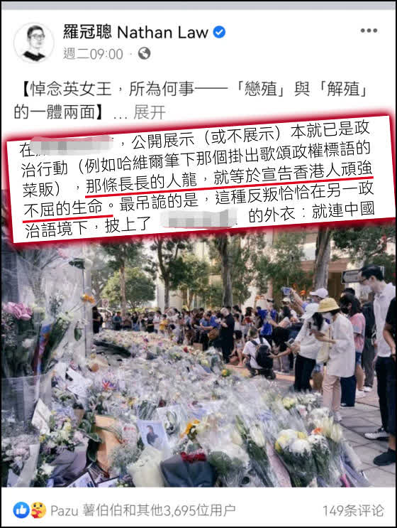 話說回來,伊麗莎白二世逝世之後,英國駐港領事館在9月9日後開放民眾獻花致意,陸續有眾多港人前來致哀,特區政府政務司司長陳國基、行政會議召集人葉劉淑儀(以個人身份)亦先後表示哀悼。作為與香港有着半個世紀瓜葛的政治人物去世,有關人士致哀表表心意,也算是展現了中國人的基本禮儀禮節,本屬情分之內,但觀乎這幾天外媒及尚殘留的黃媒,卻刻意渲染放大市民致哀情結,更有感恩殖民管治的孝子賢孫悲痛哀嚎,如喪考妣,倒是着實令人不解。如此悲情「戀殖」,想表達一種什麼樣的心結呢?正正是,「多情自古空餘恨,好夢由來最易醒。豈是拈花難解脫,可憐飛絮太飄零。」