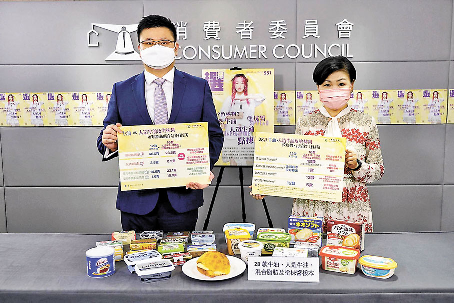 (香港文匯報 記者 聶曉輝)牛油是日常生活中常見的食材。消費者委員會測試了市面上28款預先包裝非人造牛油、人造牛油及塗抹醬,結果發現16款含植物油成分的人造牛油及塗抹醬樣本當中,逾80%(13款)驗出污染物氯丙二醇(3-MCPD);逾90%(15款)驗出基因致癌物環氧丙醇,其中一款樣本的驗出量更超出歐盟標準上限50%。消委會指出,長期攝入過量氯丙二醇會損害腎臟功能、中樞神經系統及影響雄性的生殖系統。12款非人造牛油樣本雖沒有驗出上述兩物質,但其總脂肪、飽和脂肪酸,以及反式脂肪酸含量相對較高,健康風險不容忽視。測試又發現,逾60%(17款)樣本被驗出塑化劑,含量未超出歐盟標準。