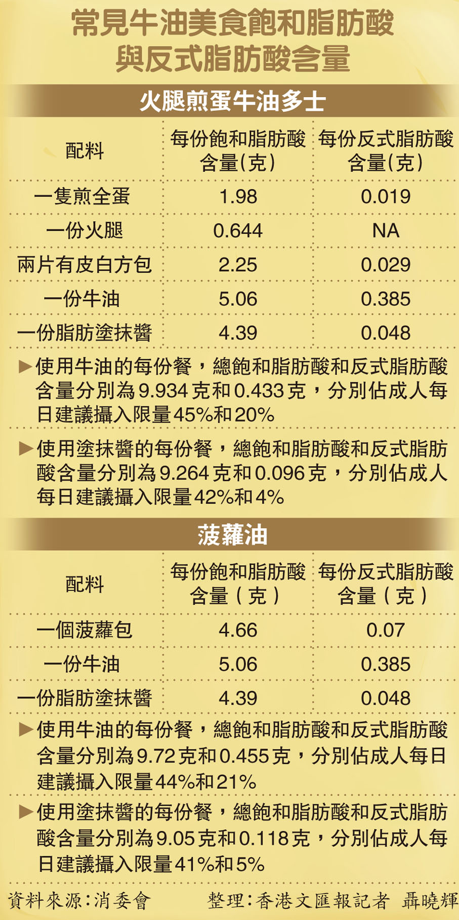 消委會指出,進食一份火腿煎蛋牛油多士所攝取的飽和脂肪酸和反式脂肪酸,分別佔國家營養學會建議成人的每日攝入限量的45%和20%;若改以脂肪塗抹醬塗多士,反式脂肪酸的攝取量則可大為降低,如進食一份港式經典美食菠蘿油,所攝取的飽和脂肪酸和反式脂肪酸亦分別佔成人每日建議攝入限量的44%和21%。