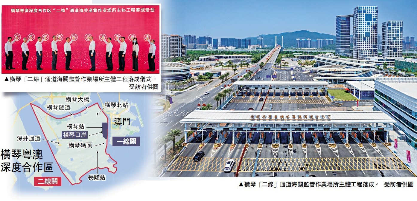 (大公報記者 方俊明珠海報道)橫琴粵澳深度合作區「二線」通道海關監管作業場所主體工程15日順利落成,朝實現橫琴全島「封關運作」,琴澳一體化邁出有力一步。接下來,該項目有序推進信息化工程、智慧口岸公共服務平台等建設,相關工程擬今年12月底完成。橫琴粵澳深度合作區執委會主任李偉農表示,該項目建成後,將有利於促進橫琴與澳門之間各類資源要素高效便捷安全流動,推動琴澳一體化高水平開放。有專家分析說,橫琴創新實施「分線管理」模式,將拓展澳門「自由港」的空間,讓澳門「自由港」的優勢延至橫琴,帶動粵港澳大灣區建設發展。