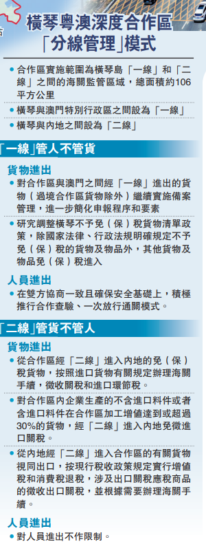2021年9月,中共中央、國務院印發了《橫琴粵澳深度合作區建設總體方案》,方案明確了合作區實施範圍為橫琴島「一線」和「二線」之間的海關監管區域,總面積約106平方公里。其中,橫琴與澳門特別行政區之間設為「一線」;橫琴與中華人民共和國關境內其他地區(以下簡稱內地)之間設為「二線」。其中在貨物方面實施「一線」放開、「二線」管住,人員進出高度便利。據介紹,「一線放開」,是對進出境貨物採用報備制,不再需要報關、報檢查驗。更有利於促進合作區與澳門之間各類資源高效流動。「二線管住」主要承擔貨物的進出境報關、報檢等查驗監管功能,並承擔對人員攜帶的行李物品和交通運輸工具載運的貨物的檢查功能。