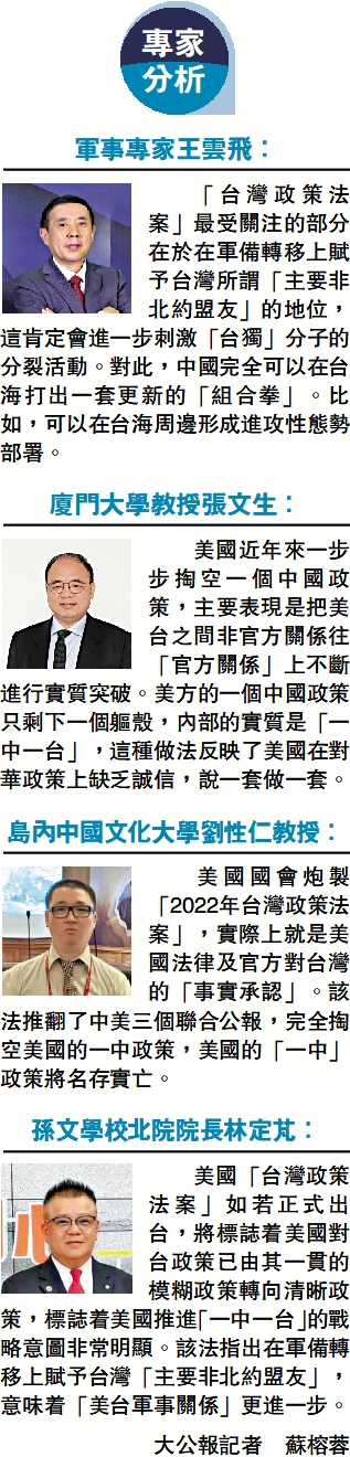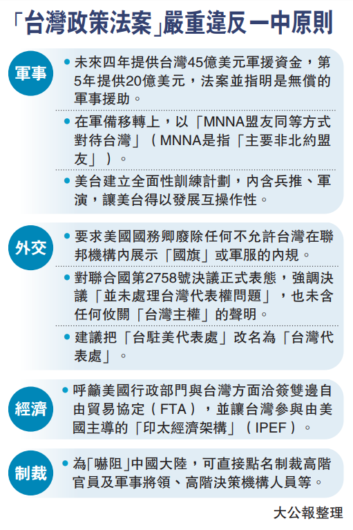 第二,「台灣政策法案」提出「未來四年提供台灣45億美元軍援資金,第5年提供20億美元,且無償的軍事援助」。根據中美三個聯合公報,美國政府聲明,它不尋求執行一項長期向台灣出售武器的政策,它向台灣出售的武器在性能和數量上將不超過中美建交後近幾年供應的水平,它準備逐步減少它對台灣的武器出售,並經過一段時間導致最後的解決。然而,多年來,美對台軍售的次數、金額越來越多,所售武器越來越先進,如今甚至還要向台灣提供無償的軍事援助,這完全就是縱容「台獨」分子持續對抗中國大陸,破壞台海和平。近年華府已提出要把台灣打造成「刺蝟」,加強所謂「自衛能力」,其算盤是企圖把「俄烏戰事」複製到台灣問題上,在台海挑起戰事,讓台當局充當美國的「代理人」與中國大陸對抗,讓台灣同胞充當炮灰,讓兩岸中國人自相殘殺,而美國則坐收漁人之利,繼續保住「世界一哥」的霸權地位。