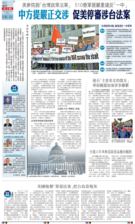 美方打「台灣牌」又有新動作。日前美國參議院外委會通過所謂「台灣政策法案」,企圖進一步全面提升「美台關係」,被視為自1979年美台「斷交」以來,最全面的美國對台政策的法案,也正因如此,如果該法案在美國參議院和眾議院皆獲通過,將是比美國國會眾議長佩洛西竄訪中國台灣地區嚴重十倍的「震撼彈」。近年美國政府口口聲聲說遵循「一個中國政策」,但另一邊廂卻不斷藉台灣問題挑釁中方。美方所謂「一中政策」根本就只是剩下一個空殼子,其實質是「一中一台」。
