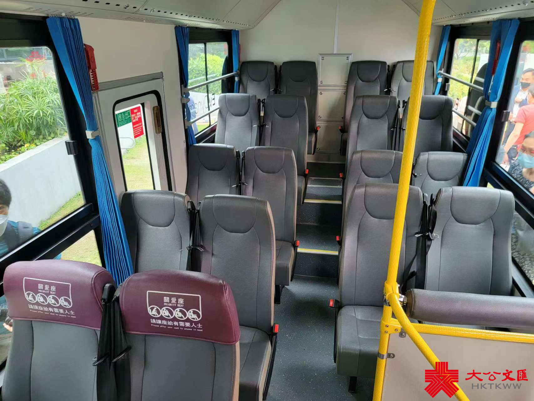 有別於一般小巴的外形,車身長7米的純電動無障礙小巴類似旅遊巴,車內空間寬敞,設18個座位,包括「關愛座」,與巴士下層一樣,而後座較前座高,走廊亦有樓梯連接。小巴採用低地台設計,提供斜板方便殘疾人士及長者乘坐,而側門旁則設有輪椅位。