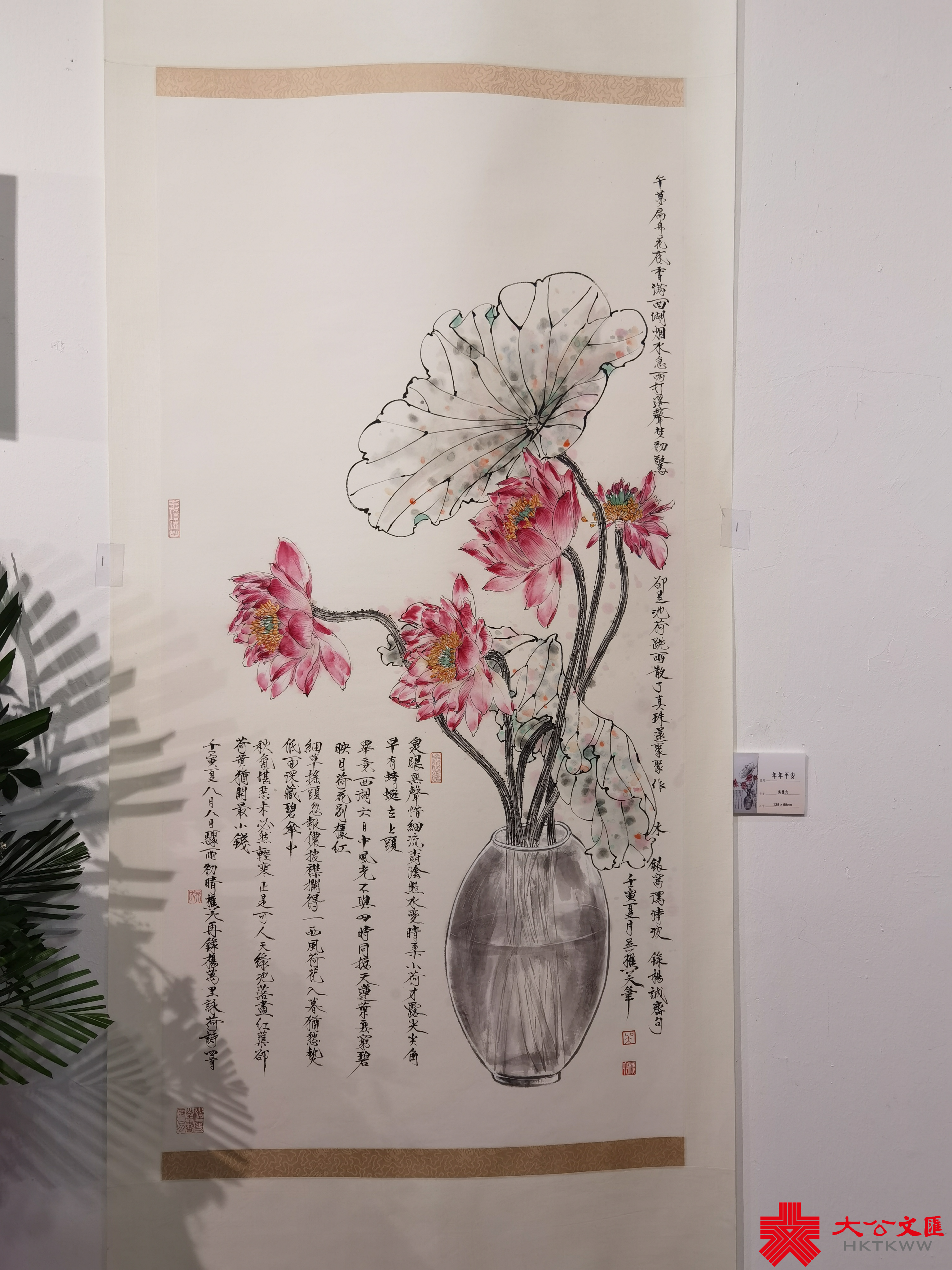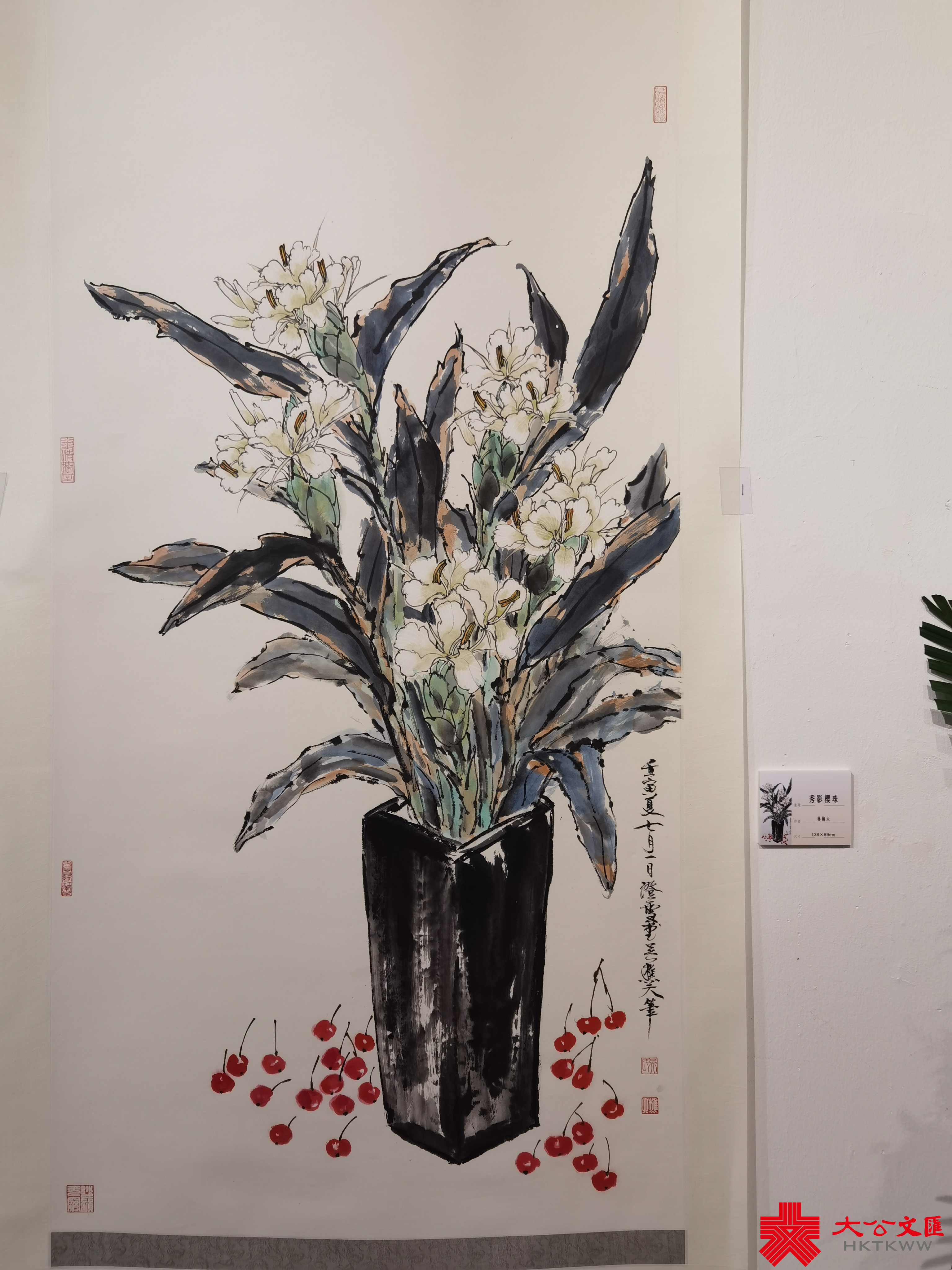 中國香港名家書畫會副會長吳樵六今次亦有兩幅作品展出,分別為《秀影櫻珠》和《年年平安》,其中《年年平安》這幅畫,幾朵蓮花插在水瓶中,希望疫情盡快過去,人人平安。而另一幅《秀影櫻珠》更是別具用心地以25朵姜花和25粒櫻桃,慶祝香港特區回歸祖國25周年。作為香港女中國書畫家協會的倡議者,吳樵六回憶當年在北京教書時,被問到香港有哪些著名女畫家,意識到本港女性畫家缺乏交流切磋藝術和展出作品的平台,倍感可惜,於是聯絡本港幾個團體,共同創立協會。