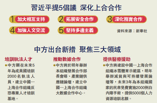 第二,拓展安全合作。歡迎各方共同參與落實全球安全倡議,秉持共同、綜合、合作、可持續的安全觀,推動構建均衡、有效、可持續的安全架構。中方願在未來5年為成員國培訓2000名執法人員,建立中國─上海合作組織反恐專業人才培訓基地,強化各方執法能力建設。