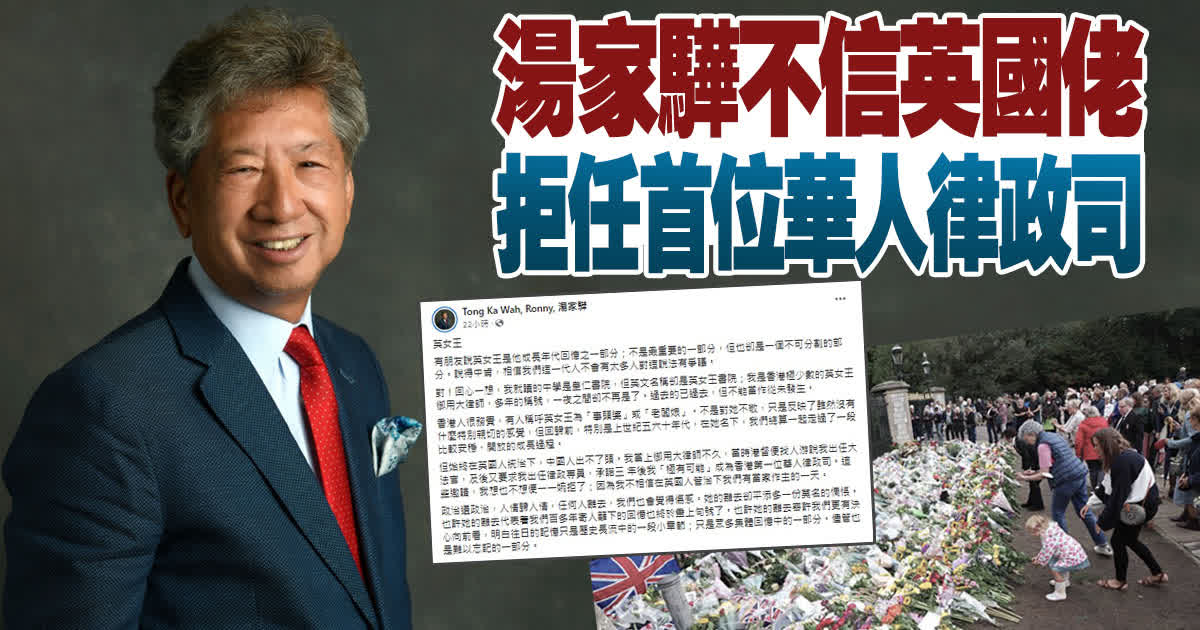 大公文匯全媒體報道:英女王伊利沙伯二世上周離世,行政會議成員湯家驊日前在社交平台撰文表示,她的離去代表着香港百多年寄人籬下的日子終於畫上句號。也許她的離去容許香港更有決心向前看,明白往日的記憶只是歷史長流中的一段小章節;只是眾多集體回憶中的一部分。