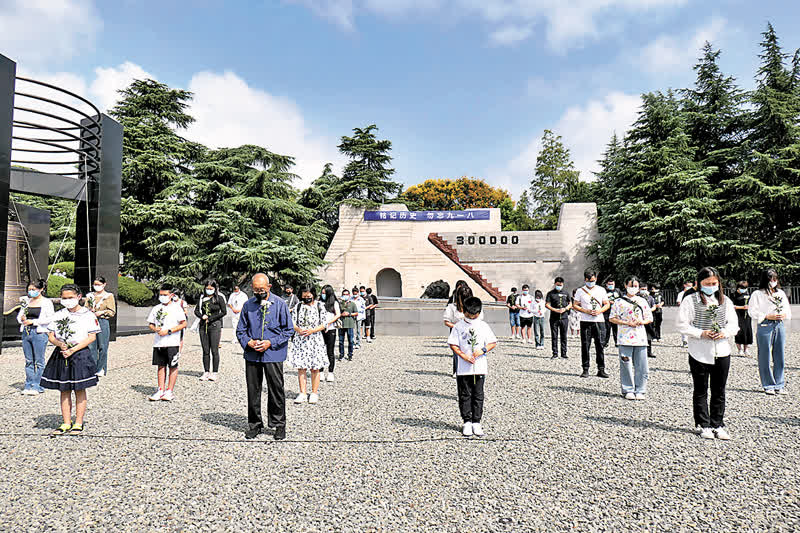 18日,南京拉響防空警報,全城默哀悼念南京大屠殺和抗日戰爭遇難同胞。南京大屠殺倖存者後代、抗戰老戰士後代、南京市青少年代表在侵華日軍南京大屠殺遇難同胞紀念館撞響和平大鐘,警示國人勿忘國恥、珍愛和平。抗戰老戰士秦華禮的女兒秦志紅參加了當天的活動。秦志紅說,作為一名抗戰老兵的後代,有責任有義務傳承這段歷史,讓更多的年輕人牢記這段歷史、學習老兵的精神,把祖國建設得更強大。