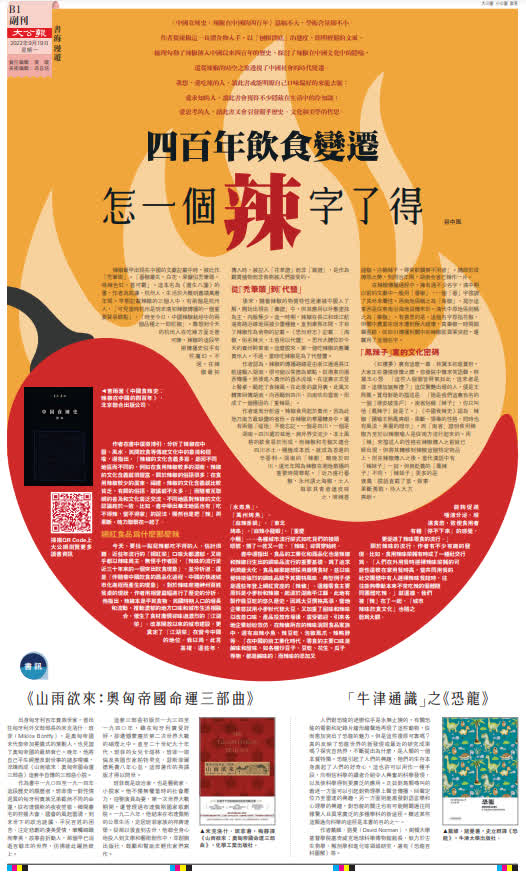 《中國食辣史:辣椒在中國的四百年》篇幅不大,學術含量卻不小。作者從辣椒這一具體食物入手,以「刨根問底」的態度,簡明輕鬆的文風,梳理勾勒了辣椒傳入中國以來四百年的歷史,探討了辣椒在中國文化中的隱喻,還從辣椒的時空之旅透視了中國社會的時代變遷。我想,愛吃辣的人,讀此書或能明瞭自己口味偏好的來龍去脈;愛求知的人,讀此書會獲得不少隱藏在生活中的冷知識;愛思考的人,讀此書又會引發關乎歷史、文化和美學的哲思。