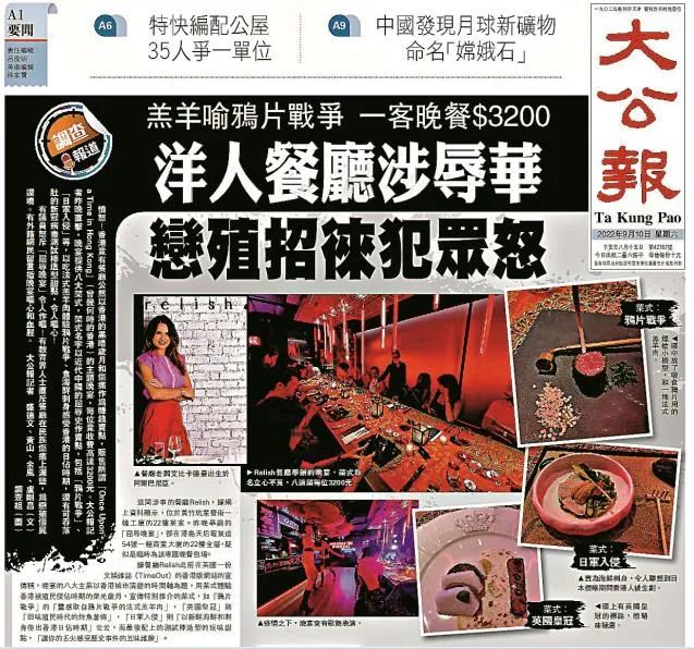 《大公報》9月10日報道有餐飲公司搞「辱華餐」。前一晚記者直擊晚餐實況後,即時向有關的Relish公司查詢。報道刊出後,對方向《大公報》作以下回覆。
