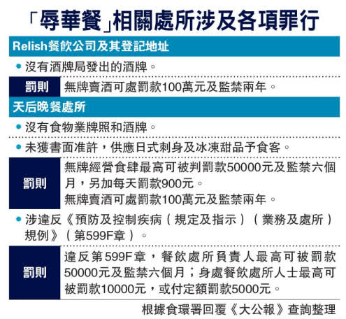 (大公報 記者余風、盛德文<文> 李斯達<資料> 調查組<圖>)本月10日,《大公報》揭發有餐飲公司大搞「辱華餐」,報道引起廣泛關注。食環署證實,報道中有關晚餐的處所及涉事的餐飲公司均無酒牌,而提供晚餐活動的處所更無食物業牌照。
