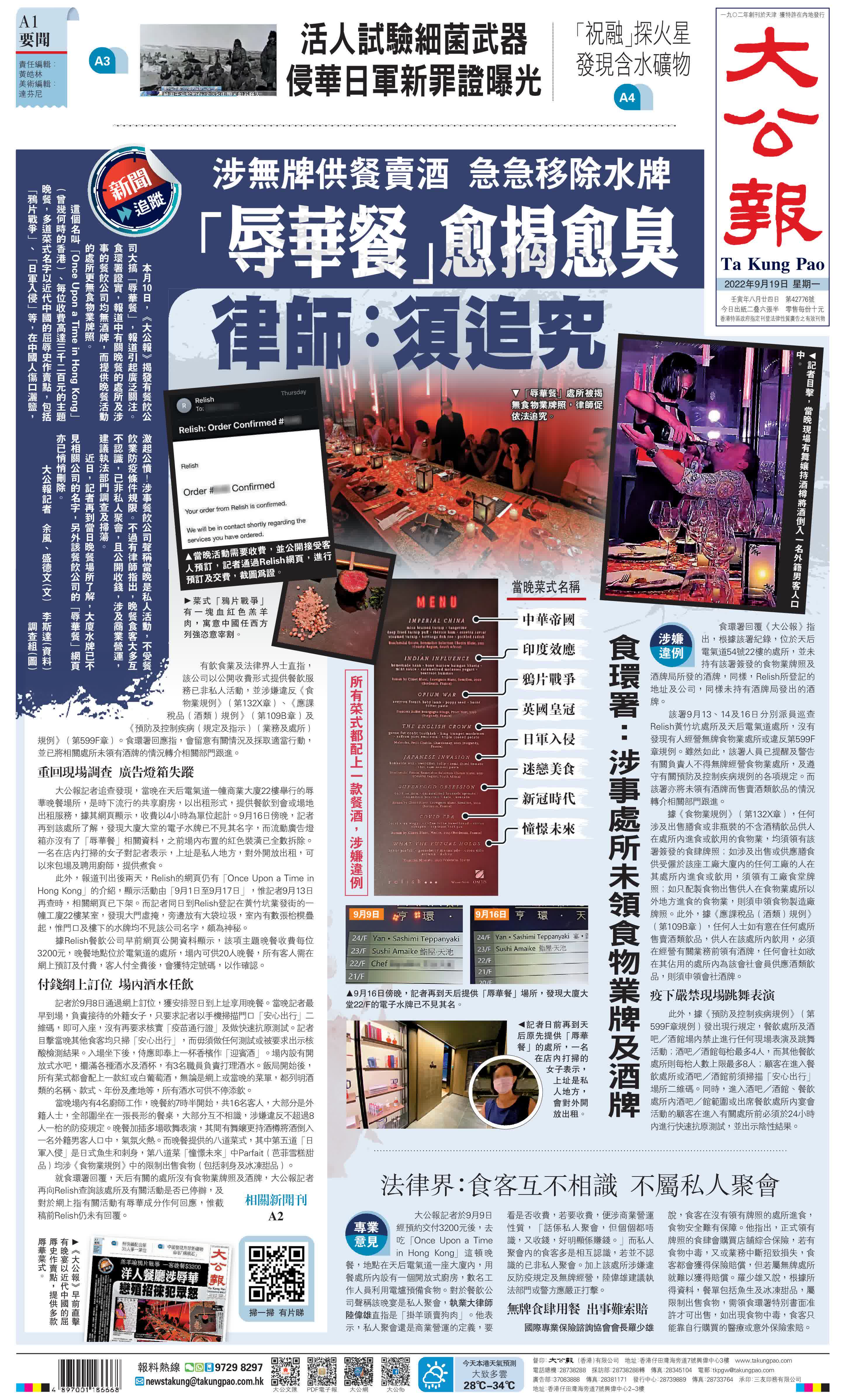 就食環署回覆,天后有關的處所沒有食物業牌照及酒牌,大公報記者再向Relish查詢該處所及有關活動是否已停辦,及對於網上指有關活動有辱華成分作何回應,惟截稿前Relish仍未有回覆。
