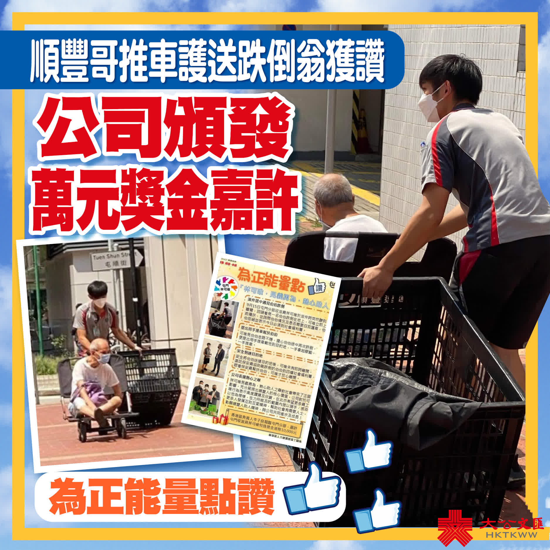 大公文匯全媒體報道,好心有好報!一名順豐收派員上周四(15日)在派件期間,用手推車載跌倒伯伯前行,獲網民在網上讚揚及分享,順豐事後表揚該名收派員見義勇為,頒發1萬元獎金嘉許。而伯伯的孫女亦發文尋人,親自向順豐哥哥致謝。