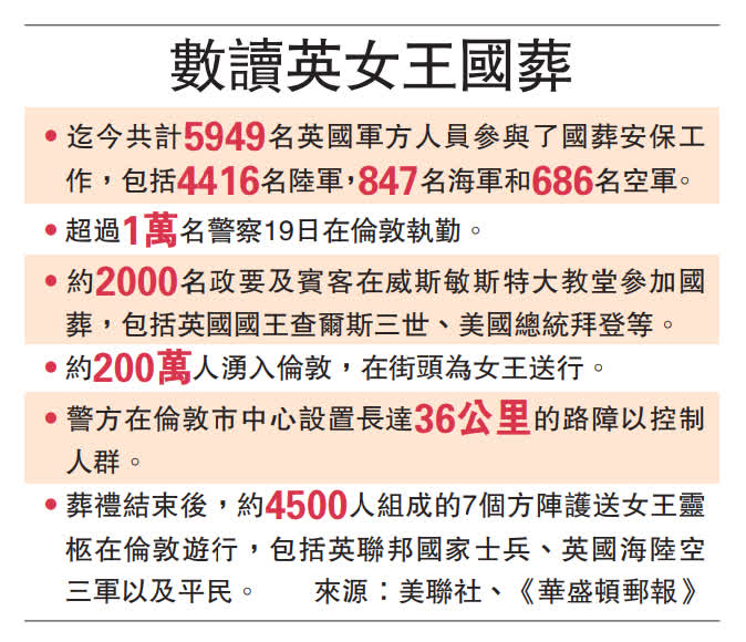 大公報綜合BBC、《衛報》、美聯社、加拿大環球新聞網、美國全國公共廣播電台報道:當地時間19日上午11時(本港時間19日下午6時),已故英國女王伊麗莎白二世的國葬在威斯敏斯特大教堂舉行,包括500名各國政要在內共計約2000人出席了葬禮。葬禮結束後,女王移靈溫莎堡,最終長眠於溫莎堡喬治六世國王紀念教堂。英國女王伊麗莎白二世為期十天的國葬落下帷幕,這場盛大的儀式耗資未公開,但外界估值至少是800萬英鎊。