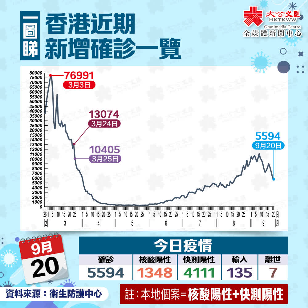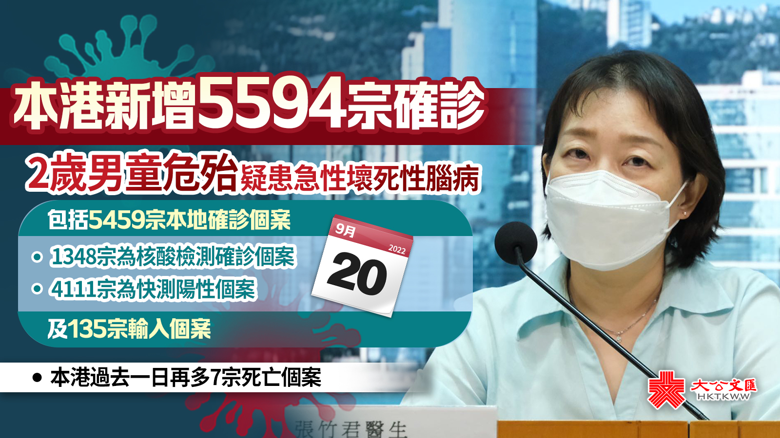 大公文匯全媒體報道,本港第五波疫情持續,衞生署及醫管局今日(20日)下午舉行疫情記者會。衞生署衞生防護中心傳染病處主任張竹君表示,截至今日零時,本港新增5594宗確診個案,包括5459宗本地確診個案及135宗輸入個案。本地確診個案當中,1348宗為核酸檢測確診個案,4111宗為快測陽性個案。
