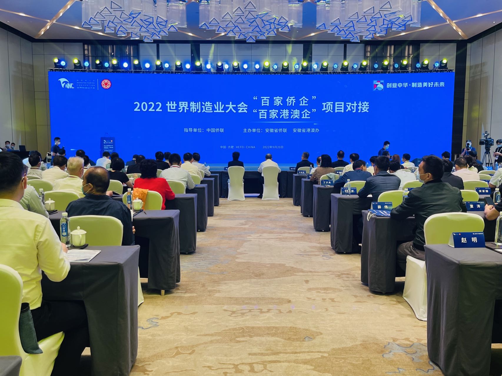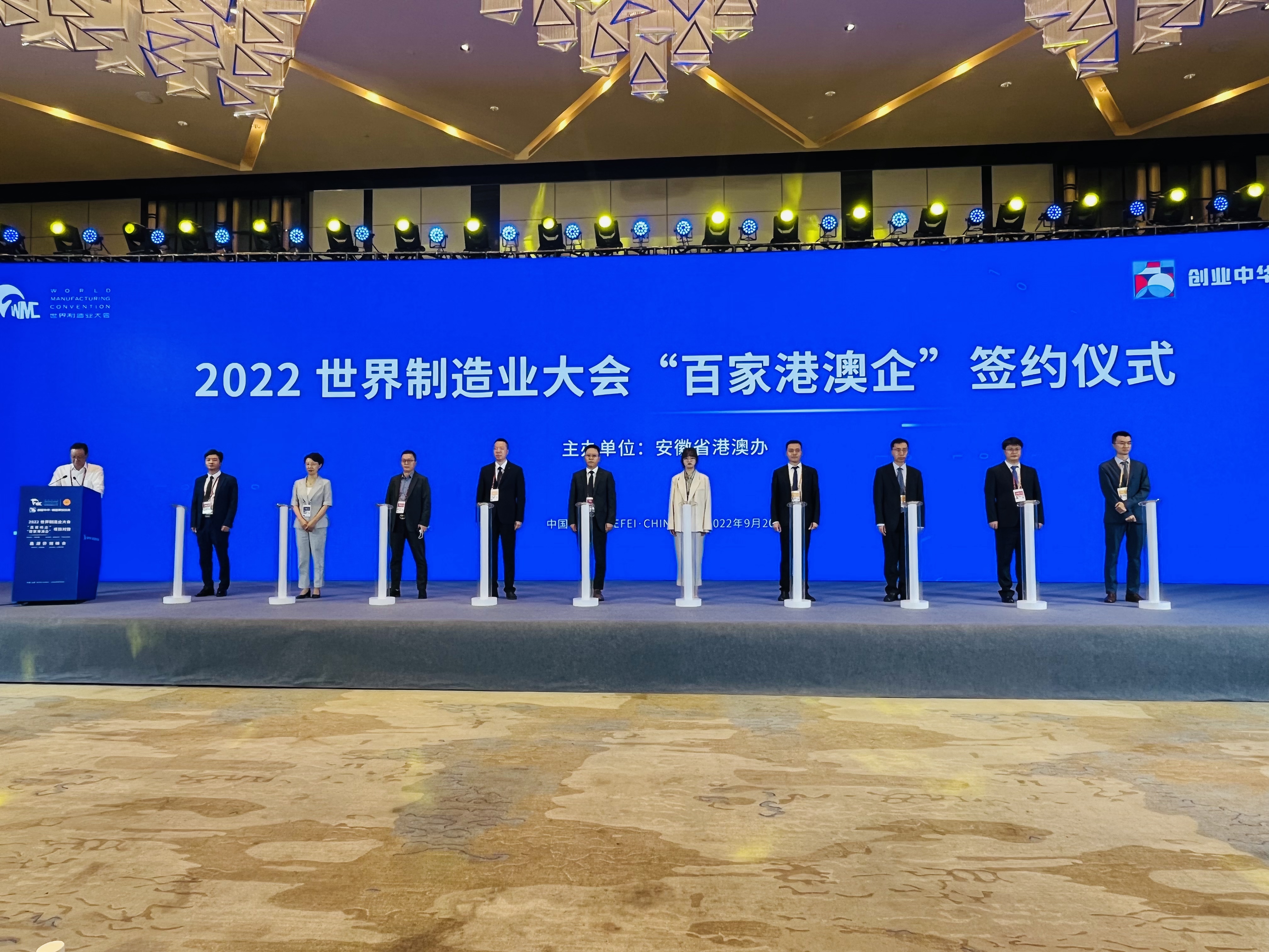(大公文匯網 記者 趙臣)2022世界製造業大會9月20日在安徽省合肥市濱湖國際會展中心開幕。作為2022世界製造業大會「六百」項目對接活動之一,由安徽省僑聯、省港澳辦共同舉辦的「百家僑企」、「百家港澳企」項目對接會當日下午在合肥舉行。本次對接會共有37個港澳資項目集中簽約,投資總額人民幣301億元(約337億港元),簽約的項目涵蓋新材料、新能源汽車和智能網聯汽車、綠色食品、生命健康等多個領域。