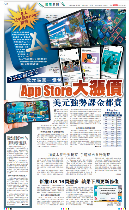 香港文匯報綜合報道:美元高企令世界各地百物騰貴,如今就連打機課金也難逃一劫。蘋果公司昨日宣布將提高全球多個國家及地區的App Store價格,所有使用歐元的國家和地區,以及日本和韓國等亞洲地區都受到影響,其中日本App Store平均加幅達到30%。雖然蘋果沒有說明加價原因,但路透社和彭博通訊社都直指,加價與美元強勢有關。
