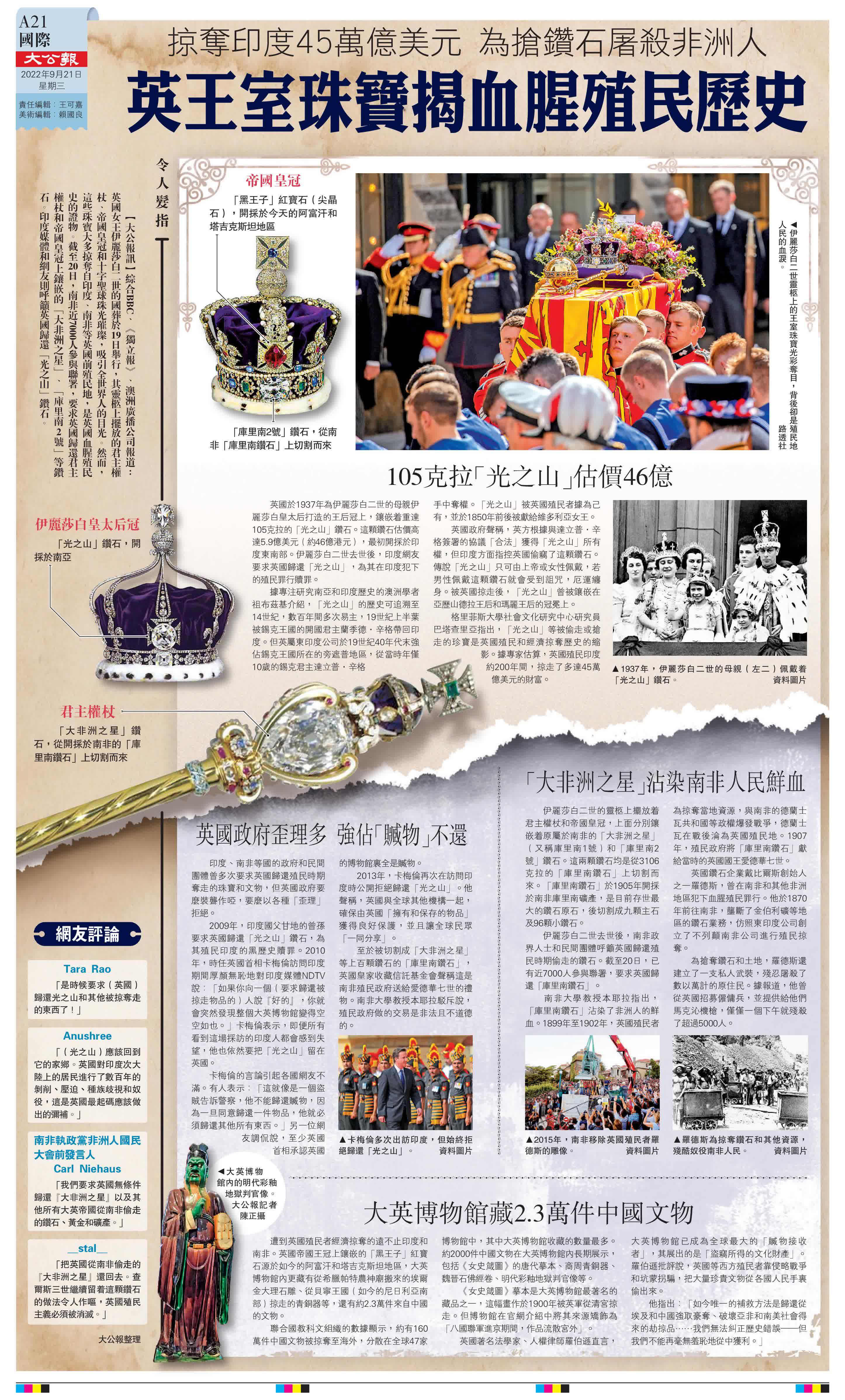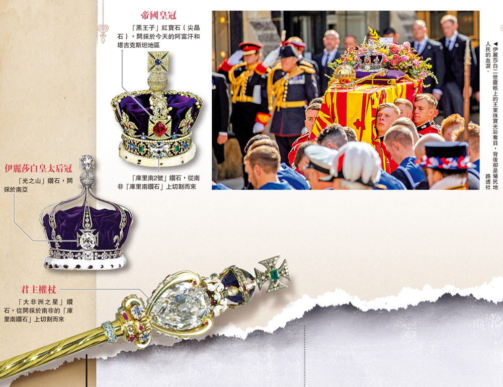 大公報綜合BBC、《獨立報》、澳洲廣播公司報道,英國女王伊麗莎白二世的國葬於19日舉行,其靈柩上擺放的君主權杖、帝國皇冠和十字聖球珠光璀璨,吸引全世界人的目光。然而,這些珠寶大多掠奪自印度、南非等英國前殖民地,是英國血腥殖民史的證物。截至20日,南非近7000人參與聯署,要求英國歸還君主權杖和帝國皇冠上鑲嵌的「大非洲之星」、「庫里南2號」等鑽石。印度媒體和網友則呼籲英國歸還「光之山」鑽石。