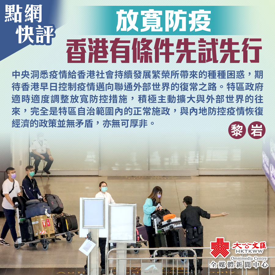 黃柳權有關本港放寬防疫「無可厚非」的講話,顯示中央洞悉疫情給香港社會持續發展繁榮所帶來的種種困惑,期待香港早日控制疫情邁向聯通外部世界的復常之路。特區政府適時適度調整放寬防控措施,積極主動擴大與外部世界的往來,完全是特區自治範圍內的正常施政,與內地防控疫情恢復經濟的政策並無矛盾,因而無可厚非。