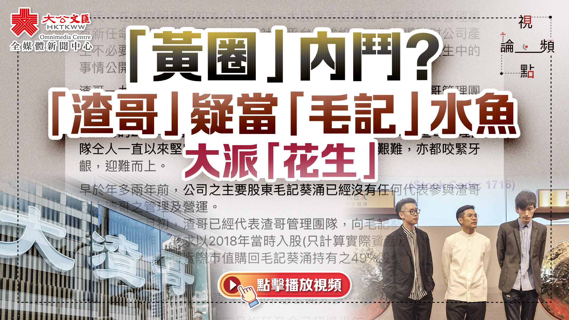 大公文匯全媒體報道,「黃圈」經常一言不合便「開片」,事實上都是一個「錢」字作怪。經營黃媒《100毛》及《毛記電視》的「毛記葵涌」,2018年底入股經營小食店的「渣哥一九九六」(渣哥),持股49%,其後又數次夾份投資成立新舖。然而,「渣哥」昨日(20日)在社交網站發文,以「早於年多兩年前,公司之主要股東毛記葵涌已經沒有任何代表參與渣哥及大渣哥之管理及營運」為由,要求「只計算實際資產及負債」回購49%股份,踢大股東「毛記葵涌」出局,怎料對方「獅子開大口,開出以倍數計的價錢,令整個團隊感到非常震驚」,「渣哥」稱可能會「集體辭職」以作「抗議」。