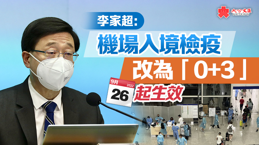 大公文匯全媒體報道,行政長官李家超今日(23日)在「應對疫情指導及協調組」記者會宣布,平衡多方面因素,海外及台灣來港由機場入境檢疫安排將由現時的「3+4」改為「0+3」,即取消酒店檢疫,改為3日家居醫學監察,9月26日(星期一)起生效。