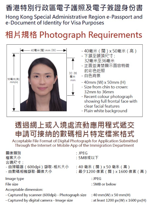 首先,網絡預約人數眾多,有一種方式申請操作約5分鐘,最快5個工作天便可拿到護照,那就是使用申請證件服務站,但需要提前準備個人照片,照片應顯示申請人的完整正面,並能清楚顯示面容特徵。相片的背景應為白色。尺寸必須為40毫米(闊)乘50亳米(高),照片中人士由下顎至頭頂的尺寸應為32毫米至36毫米,頭頂上須保留適當空位。