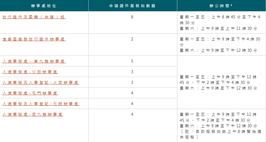 申請證件服務站無需預約,亦不設配額。申請證件服務站設在灣仔入境處總部及7間分區辦事處,可以自助形式遞交特區護照申請。透過申請證件服務站,市民可以自助「一條龍」形式提交申請,包括輸入申請資料、免費即場拍攝照片、付款等。付款方式有易辦事(EPS)、八達通、轉數快。