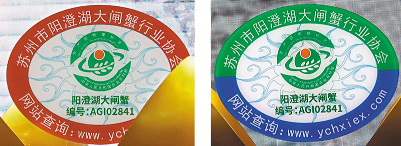 此外,陽澄湖大閘蟹防偽歷來最受關注。23日,陽澄湖大閘蟹開捕, 蘇州市陽澄湖大閘蟹行業協會在「2022中國·蘇州陽澄湖大閘蟹開捕節」現場公布了陽澄湖大閘蟹2022年版防偽溯源標識分深紅色與綠色加藍色。主辦方介紹道,以兩種顏色分別製作區分防偽溯源專用標識,是為了區分不同的養殖區域。深紅色防偽溯源專用標識用於1.6萬畝陽澄湖圍網養殖區域,綠色加藍色專用防偽溯源標識用於7.2萬畝沿湖池塘高標準養殖區域。