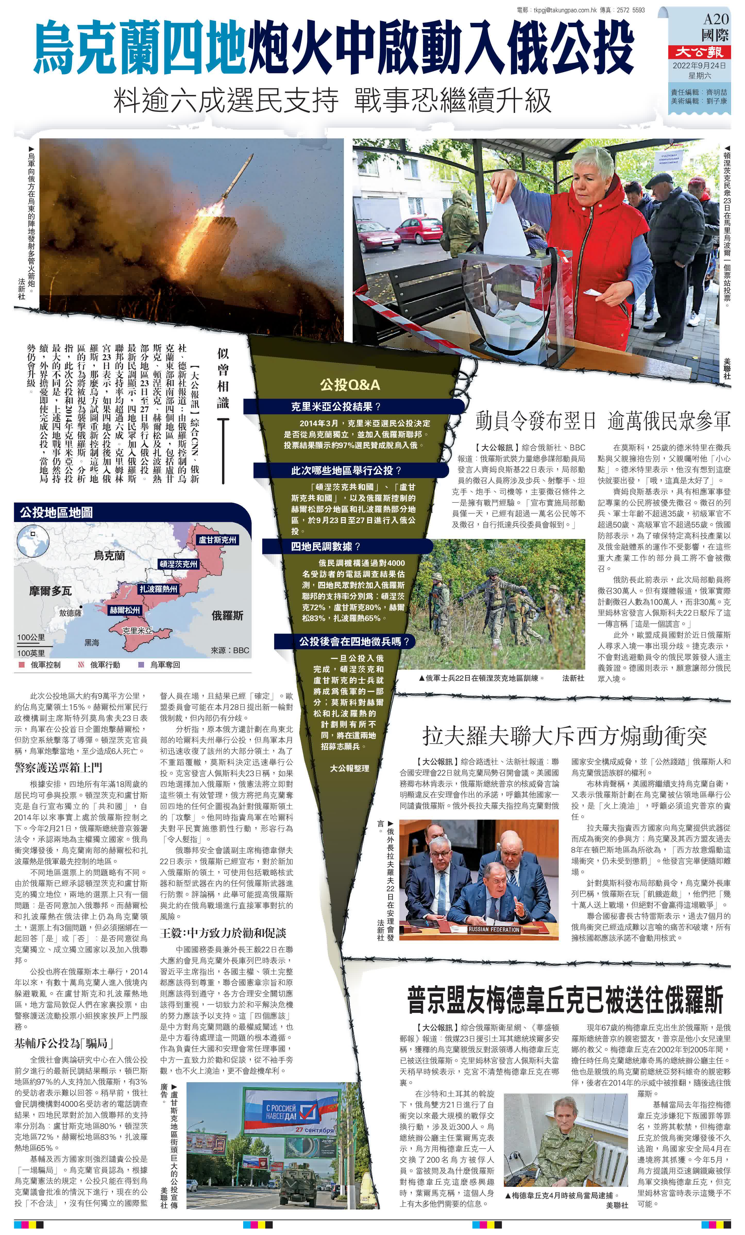 大公報訊綜合CNN、俄新社、德新社、俄羅斯衛星網、《華盛頓郵報》、BBC報道:由俄羅斯控制的烏克蘭東部和南部四個地區,包括盧甘斯克、頓涅茨克、赫爾松及扎波羅熱部分地區23日至27日舉行入俄公投。最新民調顯示,四地民眾加入俄羅斯聯邦的支持率均超過六成。克里姆林宮23日表示,如果四地公投後加入俄羅斯,那麼烏方試圖重新控制這些地區的行為將被視為襲擊俄羅斯。分析指,此次公投和2014年克里米亞公投最大的不同是,上述四地戰事仍然持續,外界擔憂即使完成公投,當地局勢仍會升級。