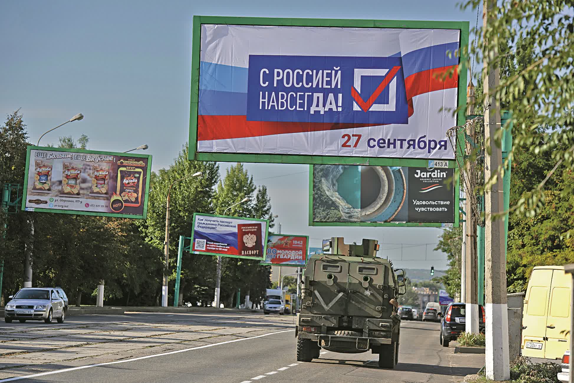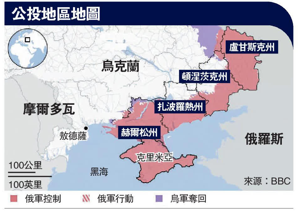 「頓涅茨克共和國」、「盧甘斯克共和國」,以及俄羅斯控制的赫爾松部分地區和扎波羅熱部分地區,於9月23日至27日進行入俄公投。