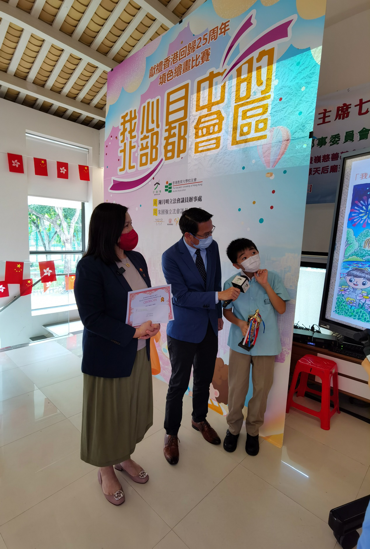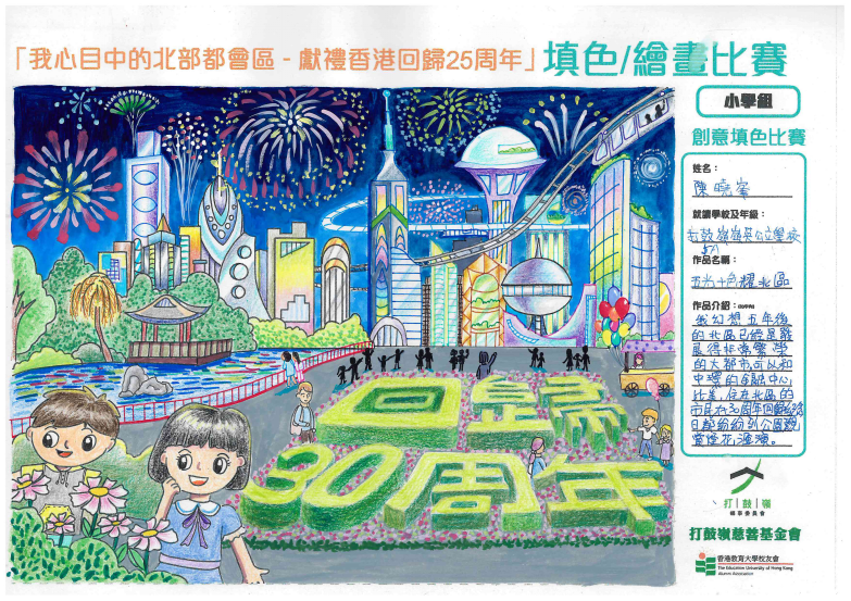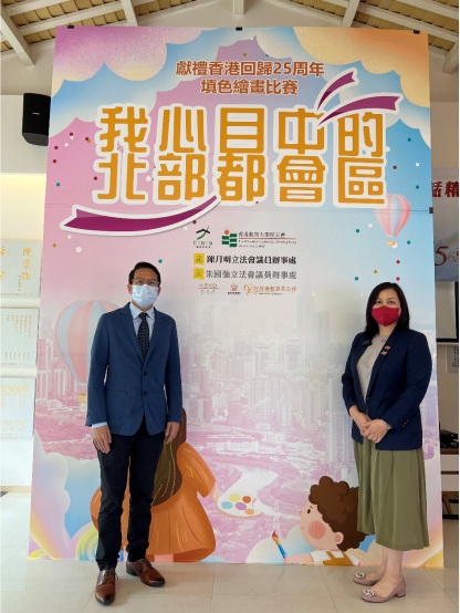 大公文匯全媒體報道,9月24日,由陳月明立法會議員辦事處、朱國強立法會議員辦事處、打鼓嶺鄉事委員會、香港教育大學校友會、新青會、鴻熙倫慈善基金、打鼓嶺慈善基金會合辦的「我心目中的北部都會區-獻禮香港回歸25周年填色繪畫比賽」頒獎儀式在打鼓嶺區舉行。立法會議員、打鼓嶺鄉事委員會主席、打鼓嶺慈善基金董事陳月明,立法會議員、打鼓嶺嶺英公立學校校長朱國強,打鼓嶺區鄉事委員會首副主席林金貴和副主席陳富鵬,鴻熙倫慈善基金主席梁慧欣,新青會副會長麥穎恩等人出席活動。