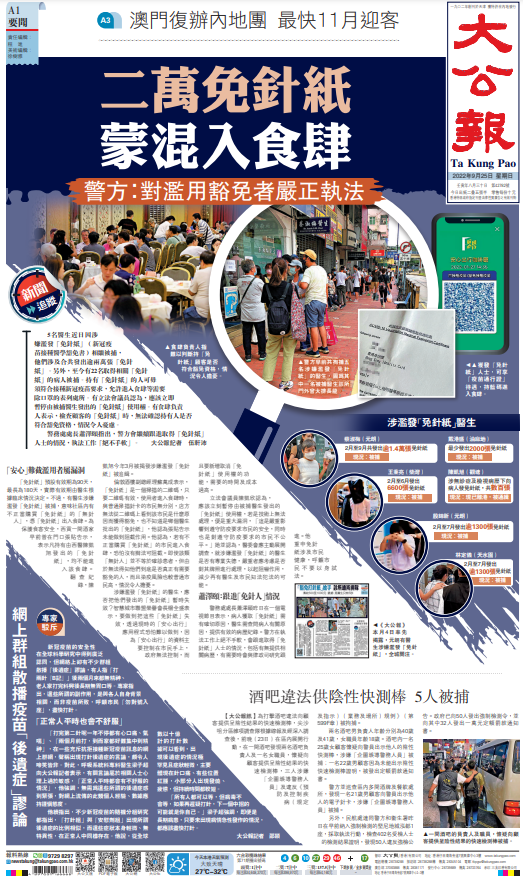 (大公報記者 伍軒沛)5名醫生近日因涉嫌濫發「免針紙」(新冠疫苗接種醫學豁免書)相繼被捕,他們涉及合共發出逾兩萬張「免針紙」。另外,至今有22名取得相關「免針紙」的病人被捕。持有「免針紙」的人可毋須符合接種新冠疫苗要求,允許進入食肆等需要除口罩的表列處所。有立法會議員認為,應該立即暫停由被捕醫生發出的「免針紙」使用權。有食肆負責人表示,檢查顧客的「免針紙」時,無法確認持有人是否符合豁免資格,情況令人憂慮。
