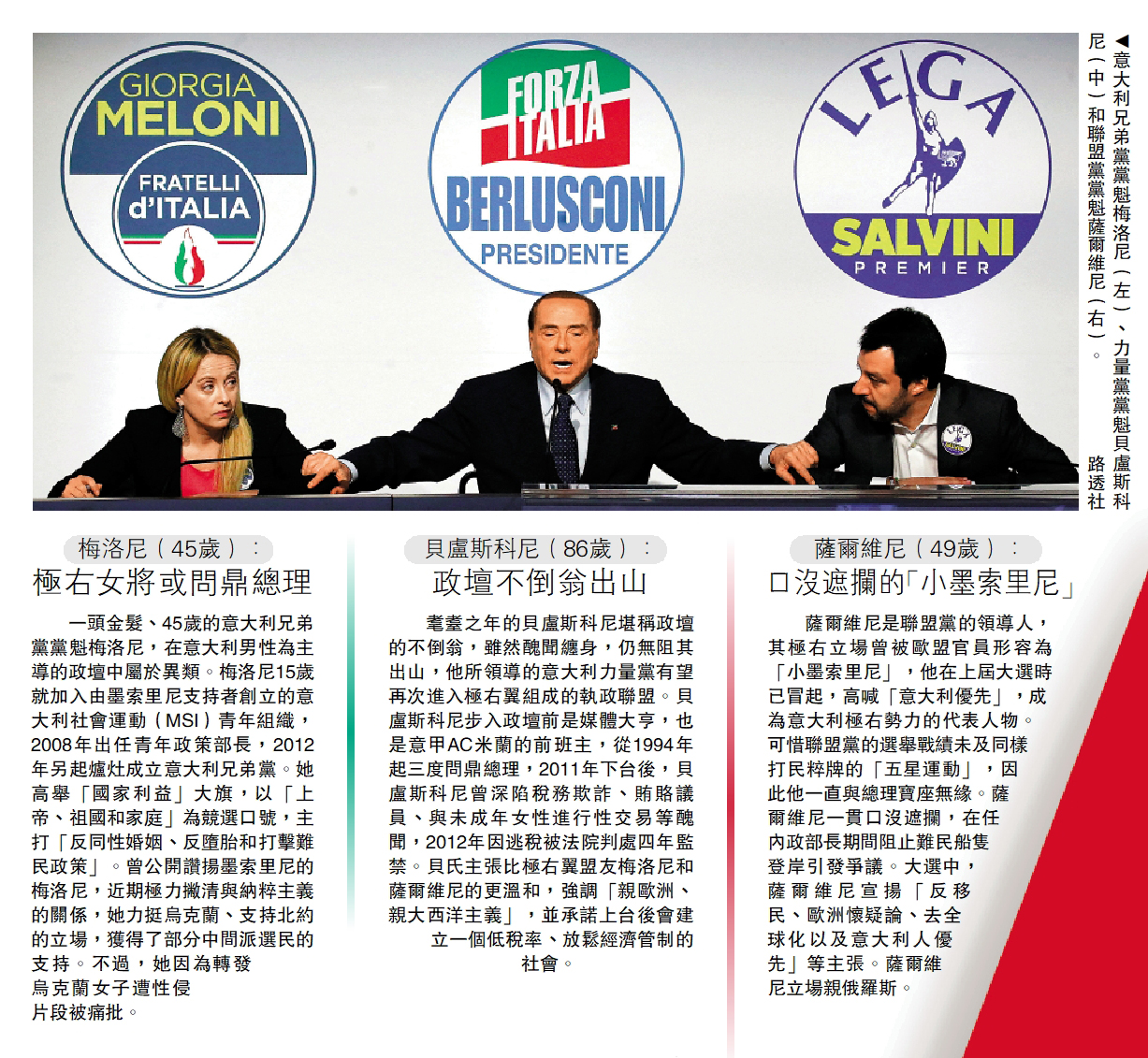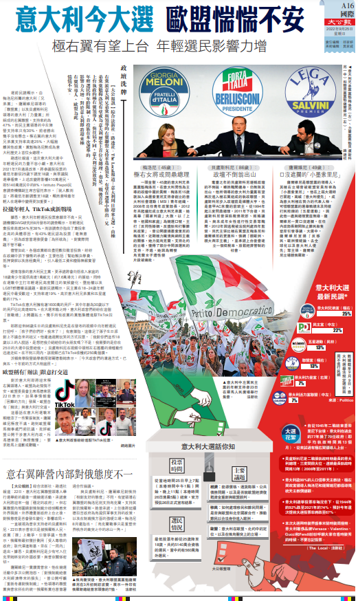 大公報綜合法新社、路透社、The Local報道:意大利周日迎來大選,由極右黨派意大利兄弟黨所領導的右翼聯盟支持率遙遙領先,有望在選舉中勝出。兄弟黨黨魁梅洛尼有望成為意大利歷史上首位女總理,也是二戰後首位上台執政的極右翼領導人。與往屆不同,意大利這次放寬對年輕選民的年齡限制,首投族在本次選舉的影響力大增。對於意大利即將迎來極右翼領導人,歐盟為此惴惴不安。