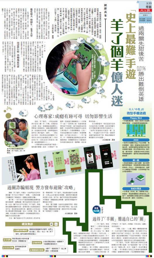 (大公報記者 夏微)整個遊戲只有兩關,湊齊三個相同圖案即可消除,消除所有圖案即可過關……「但誰能想到第二關就能這麼難?」在玩家的哀嘆聲和長達數十小時的「重新挑戰」中,消除類手機小遊戲「羊了個羊」只用半個月不到時間,就將無數玩家變成了「不通關決不罷休」的「倔驢」,也將自己順利送上微博熱搜第一,日均活躍用戶數量突破1億,相關話題閱讀量突破30億。「我就不信過不了這一關!」有網友感慨,「史上最難」的手遊「羊了個羊」令自己意識到什麼叫做「憑毅力去做一件事情」,但也有網民無奈地發現,自己已染上「羊癮」,無法自拔。