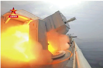 南海海域,山東艦日前首次以完全狀態進行戰鬥群實彈演習,與055型及052D型導彈驅逐艦、901型遠洋綜合補給艦、054A型導彈護衛艦聯合跨區機動、編隊作戰,全面演練空中突擊、對海打擊、防空反導、反潛、搜救、偵察等科目。