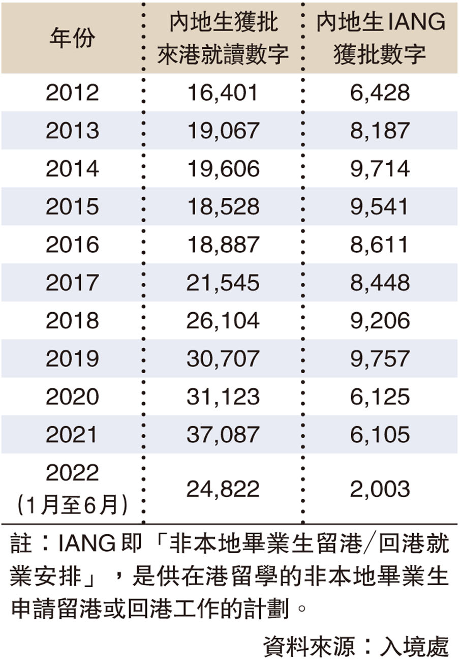 然而,反映內地生畢業後留港發展的「非本地畢業生留港/回港就業安排」(IANG)獲批數字卻在2020年按年急速回落37%後,一直未回升至疫情前水平。