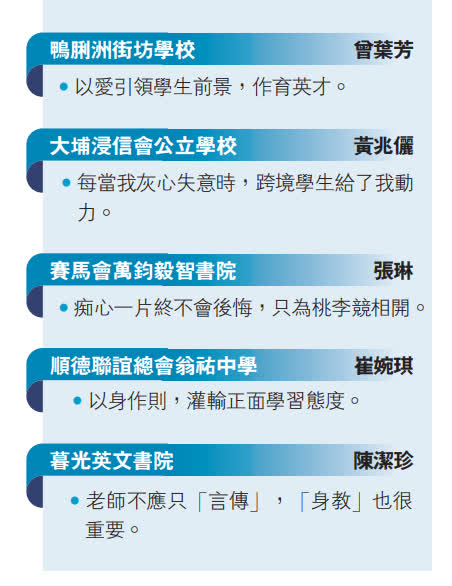 在漫長的教育生涯中,每位教師都會遇到不少辛酸時刻。有獲獎教師坦言,面對疫下上課模式的轉變倍感壓力,不得不嘗試其他教學方式,但只要看到學生學習動力提高,一切付出都是值得。亦有獲獎教師說,從學生身上體會到互信的力量。