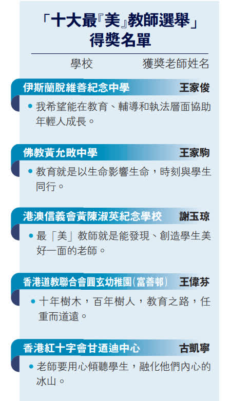 香港教育工作者聯會今年首度舉辦「十大最『美』教師選舉」,昨日向十位老師頒獎,表揚他們的默默付出。