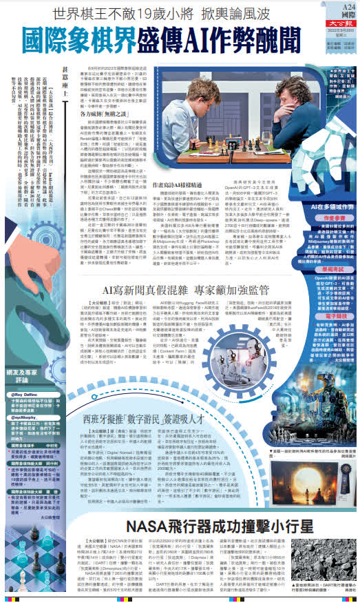 大公報綜合彭博社、《大西洋月刊》、Insider網站、「對話」網站、《紐約時報》報道,近期國際象棋界盛傳有棋手借助AI作弊的醜聞,引起各界熱議。此事源於31歲的國際象棋世界冠軍卡爾森質疑19歲對手尼曼作弊,尼曼被指通過置入體內的AI裝置輔助比賽,但各方皆無證據。卡爾森26日首次發聲明稱,尼曼作弊的次數要比他承認的兩次更多。分析指,隨着技術的發展,AI在能更好地輔助人類工作的同時,也更容易被用於作弊等不良勾當。