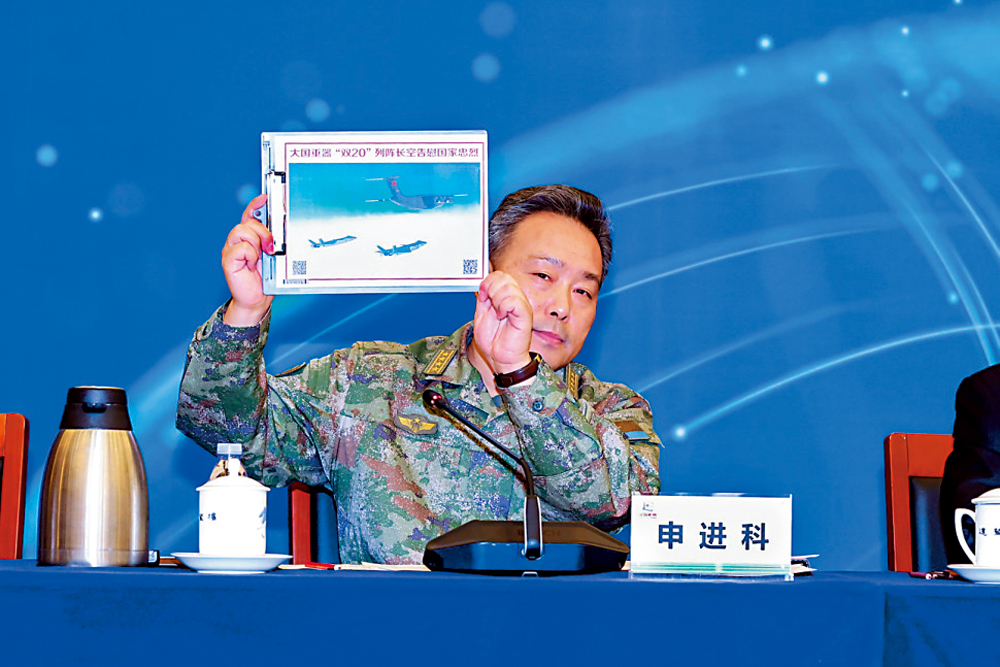 申進科首次使用了「第五代戰機」的表述,描述了中國第五代戰機殲-20的新航跡。他說,中國第五代戰機殲-20,已經遍布「東南西北中」,列裝越來越多、飛得越來越遠,在新時代練兵備戰中日益發揮重要作用。殲-20振翅東海、南海和台海的壯美航跡,畫出了一個強國強軍的同心圓。