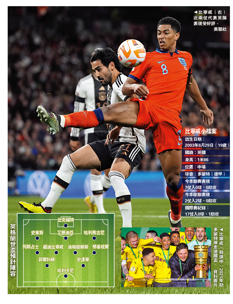 (大公報 記者 譚德龍)「三獅兵團」英格蘭隊昨晨於最後一場歐洲國家聯賽A3分組賽,主場一度從落後兩球下反先3:2,可惜最終仍遭德國逼和3:3,全部6仗不勝(3和3負)降班B聯賽。從領隊修夫基在這世界盃之前最後兩場正式比賽所派出的人腳,多少可見球隊在兩個月後世界盃正選陣容的端倪,幾名「邊緣人」的命運大致亦有定案,而英格蘭今次也並非一無所得,年僅19歲的中場祖迪比寧咸有優異演出,適時取代加雲菲臘斯的位置,已被寄望可成為「頹獅」在世界盃的救星。