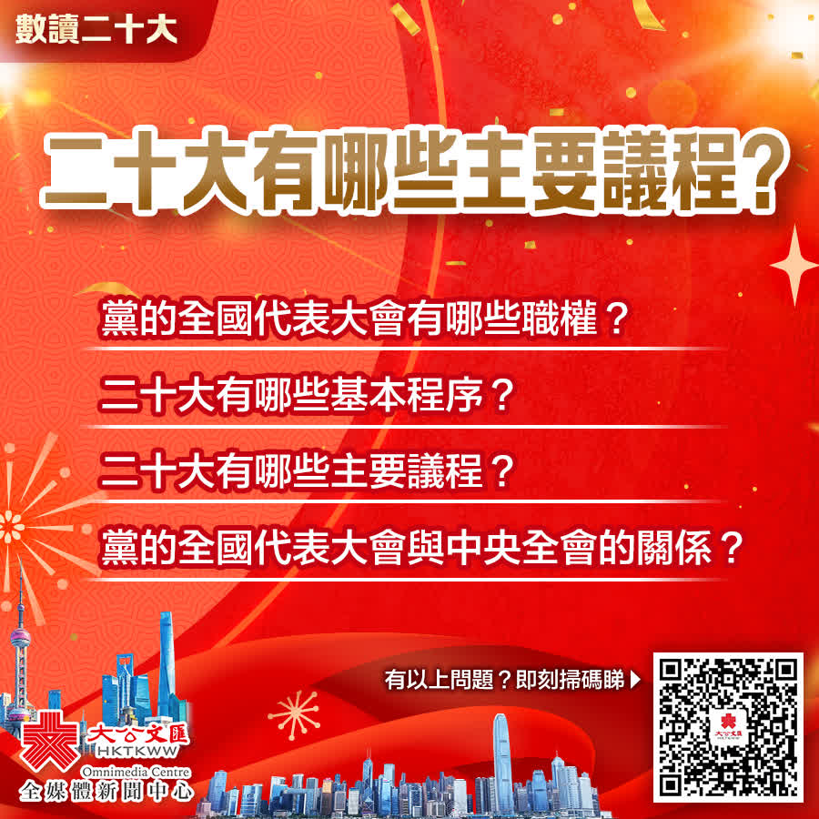 大公文匯全媒體報道:中共中央政治局會議建議,中國共產黨第二十次全國代表大會,即中共二十大,10月16日在北京召開。中共二十大代表選舉工作已順利完成,選舉產生了2296名出席黨的二十大代表。黨的全國代表大會有哪些職權?二十大有哪些基本程序?二十大有哪些主要議程?快來睇下!
