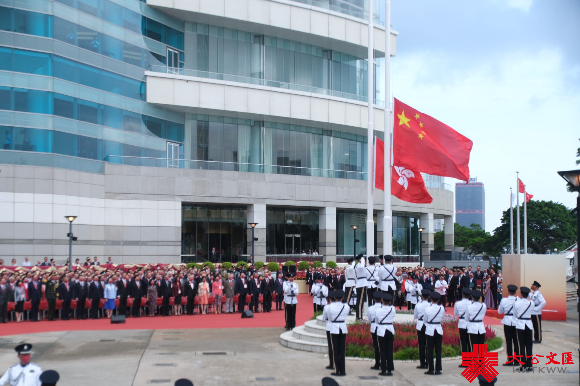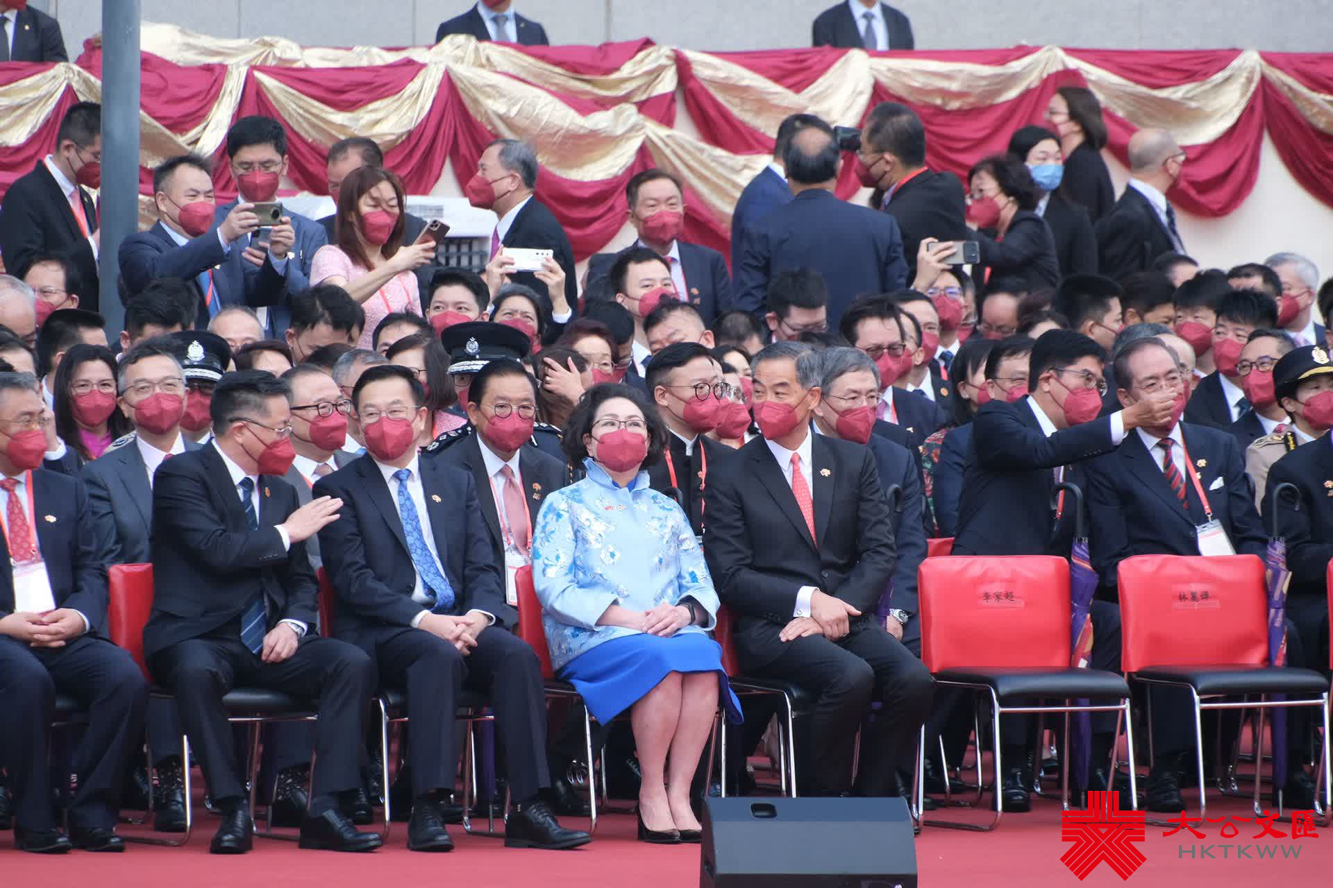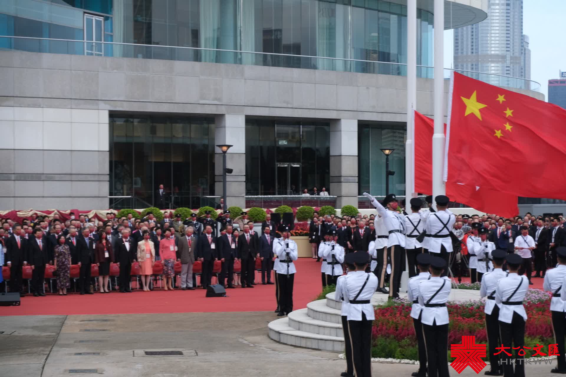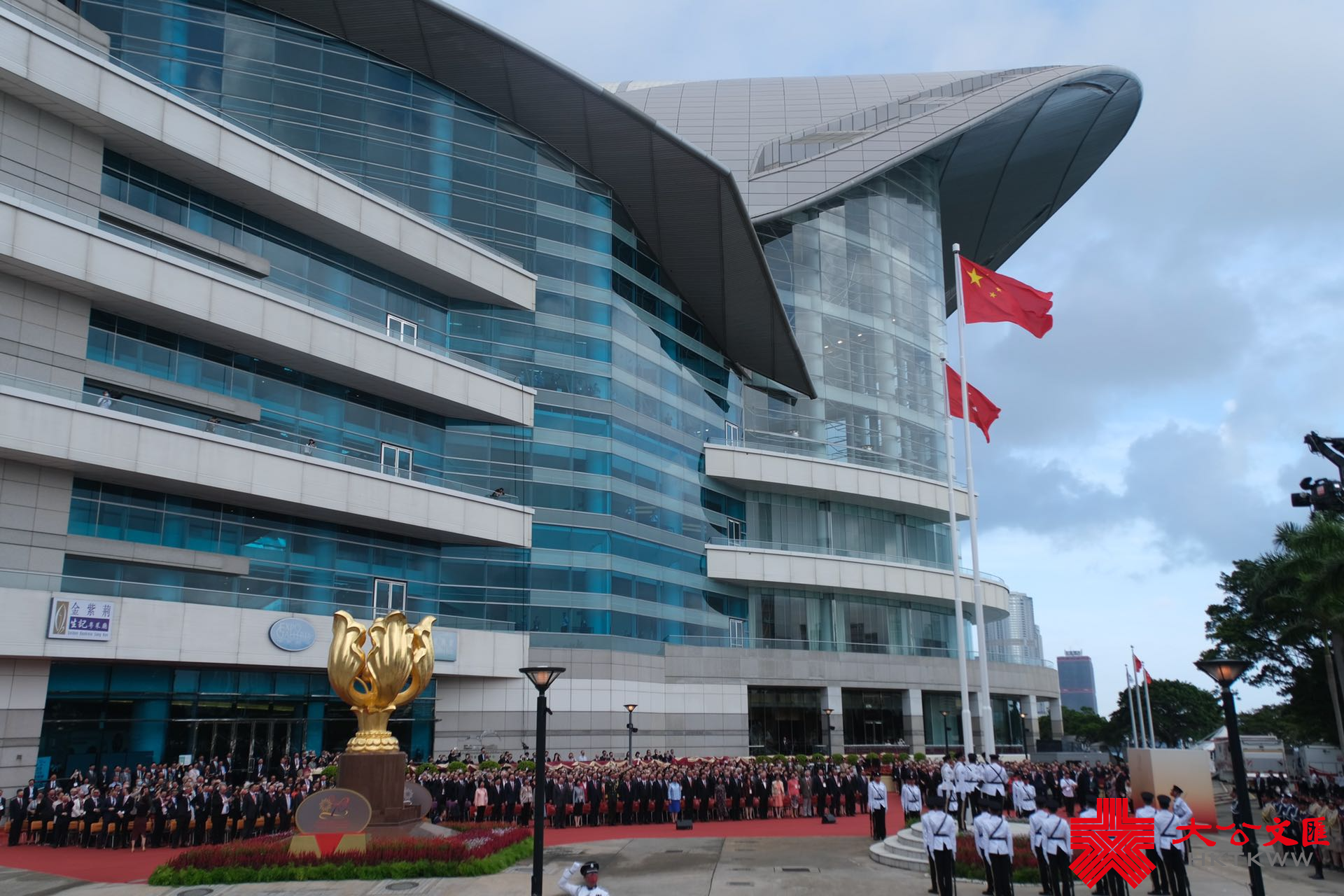 升旗儀式上午8時在灣仔香港會議展覽中心(會展)外的金紫荊廣場舉行。儀式中,警察樂隊奏樂,歌唱家譚天樂和張倩領唱國歌;紀律部隊在空中和海上敬禮。
