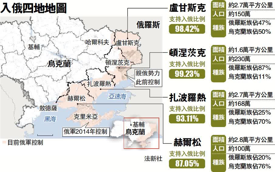 俄羅斯控制的烏克蘭頓涅茨克、盧甘斯克、赫爾松、扎波羅熱地區9月23日至27日舉行入俄公投。投票結果顯示,頓涅茨克有99.23%的選民支持加入俄聯邦,盧甘斯克有98.42%,赫爾松有87.05%,扎波羅熱有93.11%。普京9月29日簽署法令,承認赫爾松和扎波羅熱地區為「獨立領土」。2月21日,普京簽署了承認「頓涅茨克人民共和國」和「盧甘斯克人民共和國」的總統令。這四地面積合共超過九萬平方公里,加上在2014年入俄的克里米亞,烏克蘭約兩成領土併入俄羅斯。
